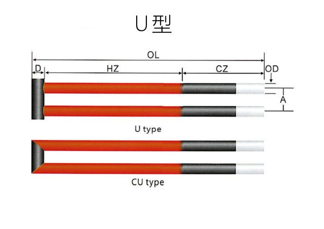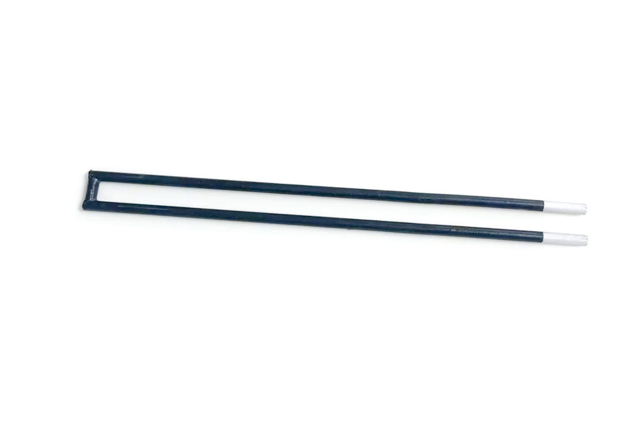 The U-type silicon carbide heating element is an integrated high-temperature resistor made from high-purity recrystallized SiC. Its two straight rods are connected by an end bridge, with customizable parameters (hot-end diameter, center spacing, hot/cold zone lengths, etc.) to suit diverse furnace layouts.